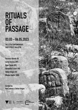Rituals of Passage is the result of a co-creative project between Ryan Falzon, Aaron Bezzina, Alexandra Fraser, Yasmine Akondo, Mladen Hadžić, and Stefan Kolgen. Rituals are part of everyday life. During times of distress, they give comfort. The title is based on the fact that rituals can bring you from one stage to another physically and mentally. Post-covid rituals can help us find balance in a disrupted society where attention to mental health and well-being has become important. Rituals can help make us name and discuss these issues. The artists created the works with the exhibition space in mind, presenting them in such a way that they interact with each other and that they challenge the viewer, offering context for the audience to create their own story. During the opening weekend some works will be accompanied by a performance and a discussion session about the meaning of rituals will be organized, followed by a meet and greet with the artists.